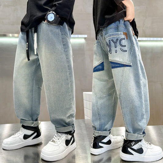 Teen Boys Jeans Spring Fall Children's Trousers Loose Fashion Cartoon Ripped Hole Toddler Korean Kids Casual Denim Pants 5-14 Y
