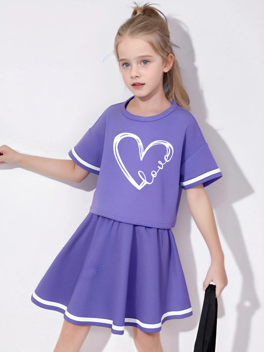 Summer girls' two-piece short sleeved top+pleated skirt set, printed pattern, casual and comfortable, suitable for outdoor sport
