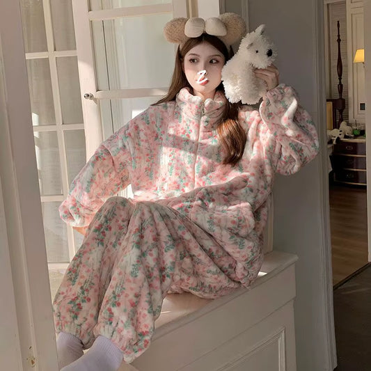 Coralline Fce Spwear Women'S Sle Winter New Flower Pattern Thiened Flannel Zipper Autumn Winter Home Clothes