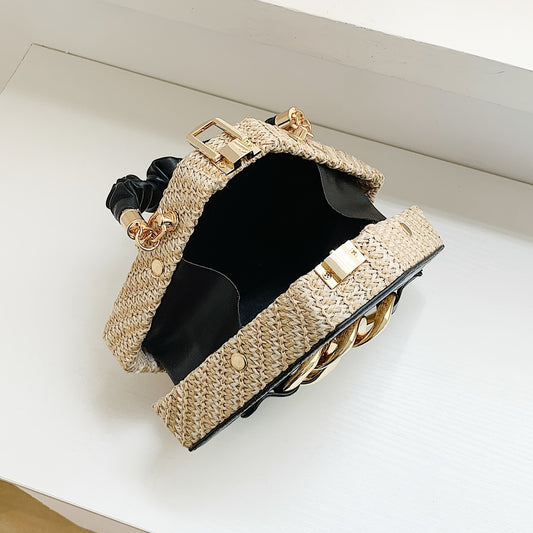 Trendy Chain Handbag, Fashion Top Handle Straw Box Bag, Women's Vacation Style Purse