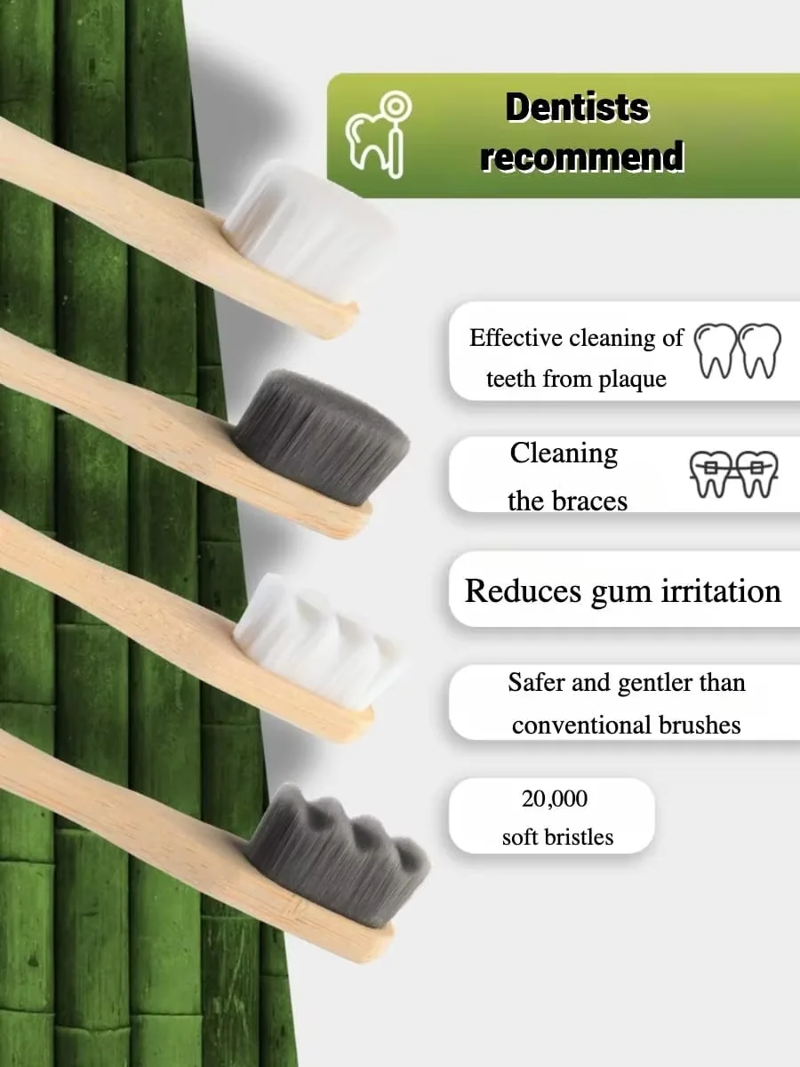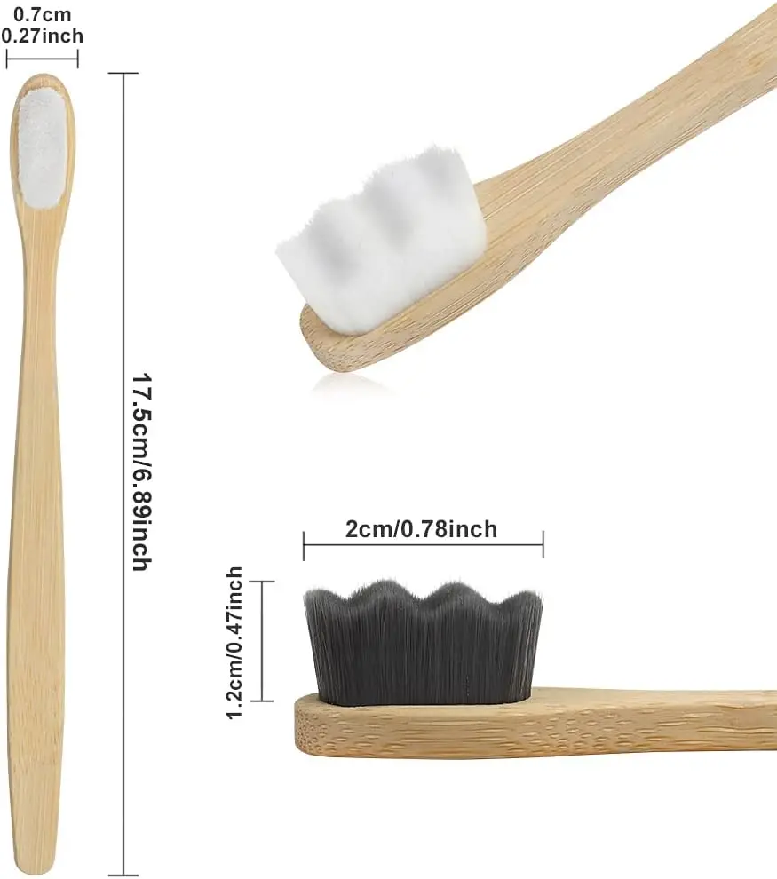 WHAT WILL YOU GET:Each package includes 4 pieces bamboo soft bristle toothbrushes, 2 each of white bristles and grey bristles.with 20,000 ultra-soft wave-shaped bristles. Each toothbrush is individually packaged within the set, making it perfect for traveling and sharing with othersThe size of each toothbrush is 0.7cm × 17.5cm / 0.27inch × 6.89inch, and the bristle's length is 1.2cm / 0.47inch. Proper size, easy to hold and convenient to carry.