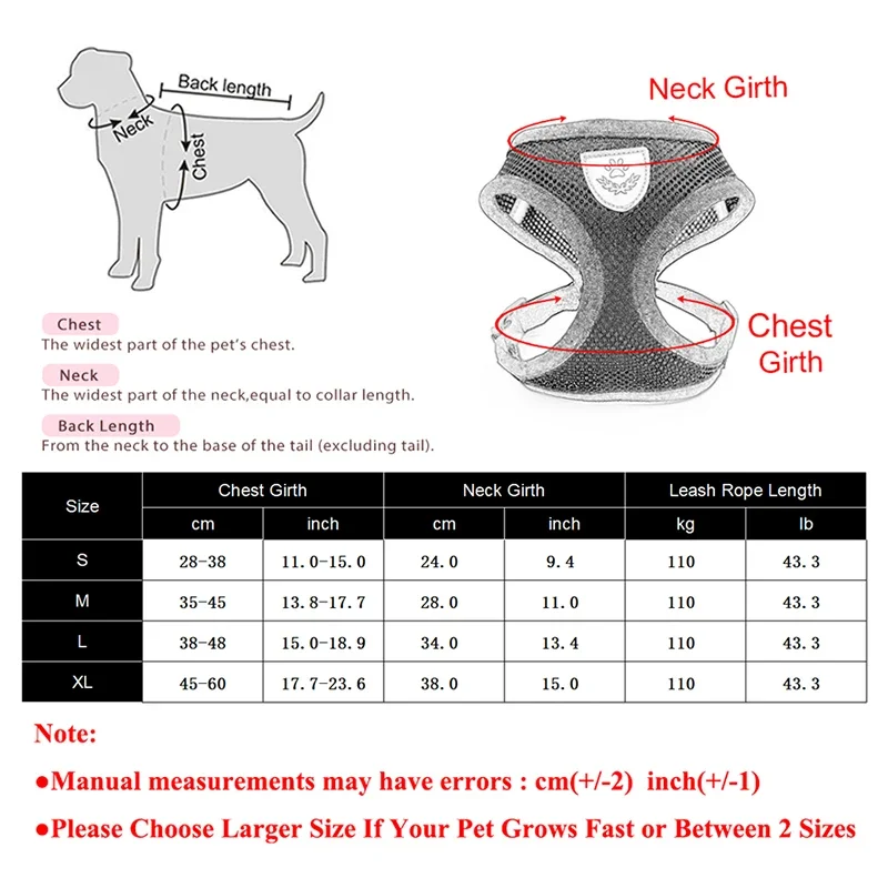 XL: Chest:45-60cm,17.7-23.6inch;Neck:38cm,15.0inch;Leash Rope Length:110cm,43.3inch.